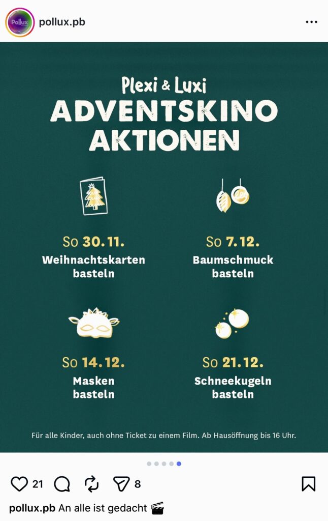 Wenn ein Kino in der Vorweihnachtszeit zu einem Ort wird, an dem Kreativität und Gemeinschaft genauso wichtig sind wie der Film selbst, entsteht genau jene Art von Erlebnis, die Familien lange in Erinnerung behalten. Das Pollux in Paderborn zeigt das mit seinem Plexi & Luxi Adventskino besonders eindrucksvoll. An vier Sonntagen im Advent lädt das Kino Kinder dazu ein, direkt vor Ort zu basteln: Weihnachtskarten, Baumschmuck, Masken und Schneekugeln. Jede Woche ein anderes Thema und jedes Mal ein greifbares Stück Weihnachtsvorfreude.